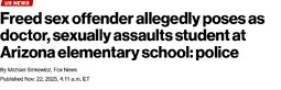 >>23888048 A convicted sex offender freed from prison two weeks ago allegedly posed as a doctor, sexually assaulted a student inside an AZ elementary school