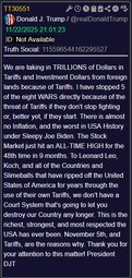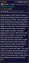 We are taking in TRILLIONS of Dollars in Tariffs and Investment Dollars from foreign lands because of Tariffs. I have stopped 5 of the eight WARS directly because of the threat of Tariffs if they don’t stop fighting or, better yet, if they start. There is almost no Inflation, and the worst in USA History under Sleepy Joe Biden. The Stock Market just hit an ALL-TIME HIGH for the 48th time in 9 months. To Leonard Leo, Koch, and all of the Countries and Slimeballs that have ripped off the United States of America for years through the use of their own Tariffs, we don’t have a Court System that’s going to let you destroy our Country any longer. This is the richest, strongest, and most respected the USA has ever been. November 5th, and Tariffs, are the reasons why. Thank you for your attention to this matter! President DJT