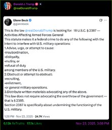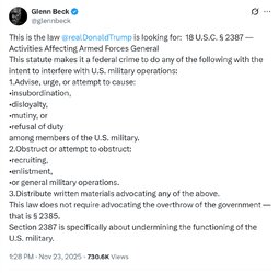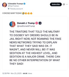 >>23893688 @JDVance - If the president hasn't issued illegal orders, them members of Congress telling the military to defy the president is by definition illegal.