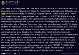 >>23904614 @realDonaldTrump The Creeps at the Failing New York Times are at it again. I won the 2024 Presidential Election in a Landslide, winning all Seven Swing States, the Popular Vote, and the Electoral College by a lot. I one our Nation’s Districts by 2750 to 550, a complete wipeout. I settled 8 Wars, have 48 New Stock Market Highs, our Economy is Great, and our Country is RESPECTED AGAIN all over the World