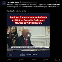 >>23911437, >>23911430, >>23911573, >>23911575, >>23911591, >>23911597, >>23911603, >>23911618, >>23911626 @POTUS announces that U.S. Army Specialist Sarah Beckstrom of Summersville, West Virginia, one of the National Guardsmen savagely attacked yesterday in Washington, D.C., has just passed away.