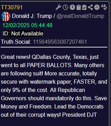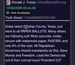 >>23930383, >>23930377 @realDonaldTrump Great news! QDallas County, Texas, just went to all PAPER BALLOTS. (no Qoinkidinks)