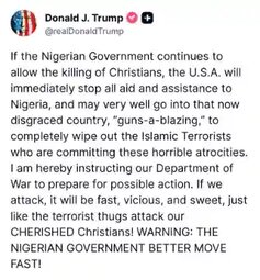 “Tonight, at my direction as Commander in Chief, the United States launched a powerful and deadly strike against ISIS Terrorist Scum in Northwest Nigeria, who have been targeting and viciously killing, primarily, innocent Christians, at levels not seen for many years, and even Centuries!” Trump said on Truth Social. Coninue…
