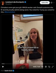 Cinnabon come get your girl. MAGA worker calls Somali customers the N-word & proudly admits being racist. You voted for Trump you voted for this. #DemsUnited