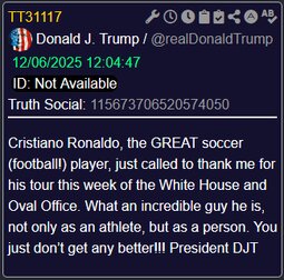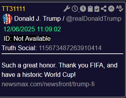 >>23948178, >>23948237 @realDonaldTrump Such a great honor. Thank you FIFA, and have a historic World Cup!