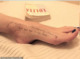 One set of photos showed an unidentified woman's body parts inscribed with quotes from Vladimir Nabokov's Lolita - with the novel pictured in the background.