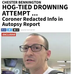 According to the report, nine months before his death, Bennington got drunk, hog-tied himself, and threw himself into a pool in a suicide attempt, but changed his mind and freed himself.