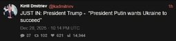 >>24039288, >>24039292 @realDonaldTrump I just had a good and very productive telephone call with President Putin of Russia prior to my meeting, at 1:00 P.M. today, with President Zelenskyy of Ukraine.