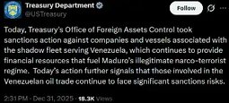 >>24053241, >>24053245 Treasury’s Office of Foreign Assets Control took sanctions action against companies and vessels associated with the shadow fleet serving Venezuela