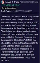 >>24051846 @realDonaldTrump God Bless Tina Peters, who is now, for two years out of nine, sitting in a Colorado Maximum Security Prison, at the age of 73, and sick, for the “crime” of trying to stop the massive voter fraud that goes on in her State ( where people are leaving in record numbers!). Hard to wish her a Happy New Year, but to the Scumbag Governor, and the disgusting “Republican” (RINO!) DA, who did this to her (nothing happens to the Dems and their phony Mail In Ballot System that makes it impossible for a Republican to win an otherwise very winnable State!), I wish them only the worst. May they rot in Hell. FREE TINA PETTERS!