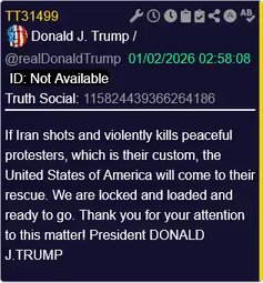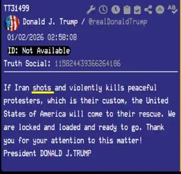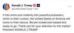 >>24059947, >>24059947 , >>24059950, >>24059952, >>24059963 , PDJT: If Iran shots and violently kills peaceful protesters, which is their custom, the United States of America will come to their rescue. We are locked and loaded and ready to go. Thank you for your attention to this matter!