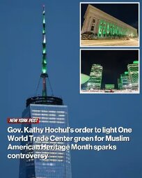 Democratic New York Gov. Kathy Hochul sparked outrage Friday after ordering that 16 state landmarks – including Manhattan’s One World Trade Center – be illuminated in green to celebrate “the heritage and culture of Muslim Americans.”