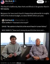 >>24080870 Musk: My guess for how much fraud is happening nationwide is roughly 10% of the Federal budget, so about $700 billion per year.