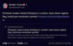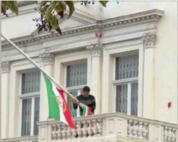 >>24103778, >>24103781 @realDonaldTrump Protester scales Iranian Embassy in London, tears down regime flag, hoists pre-revolution symbol