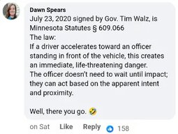 >>24113407 Tim Walz signed into law in 2020…MN law §609.066: Officers can use deadly force if a driver accelerates toward them, creating immediate life-threatening danger. No need to wait for impact—they can act based on apparent intent & proximity.