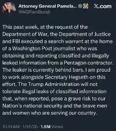 >>24120508 FBI agents raided WaPo reporter Hannah Natanson’s Virginia home amid a probe into gov't contractor Aurelio Perez-Lugones, accused of illegally retaining classified materials, Her phone and Garmin watch were seized.