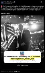 >>24120665, >>24120836, >>24120923 US freezes all visa processing for 75 countries, re: Somalia, Russia, Afghanistan, Brazil, Iran, Iraq, Egypt, Nigeria, Thailand, Yemen and more
