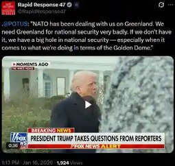 >>24130466 @POTUS: "I may put a tariff on countries if they don't go along with Greenland — because we need Greenland for national security."