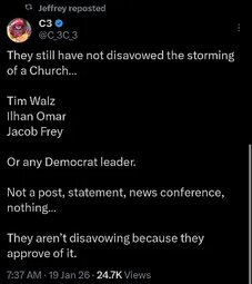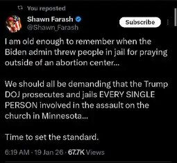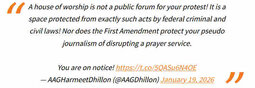 >>24143093, >>24143097, >>24143098 The Civil Rights Division of the Department of Justice (DOJ) is looking into possible violations stemming from a protest by anti-ICE demonstrators at a church in St. Paul, Minnesota/Don Lemmon