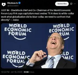JUST IN - BlackRock chief and Co-Chairman of the World Economic Forum Lary Fink says capitalism must evolve: "If AI does to white-collar work what globalization did to blue-collar, we need to confront that directly." — Axios
