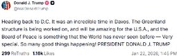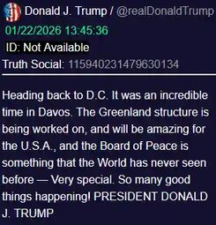 >>24158579, >>24158635 @realDonaldTrump Heading back to D.C. It was an incredible time in Davos. The Greenland structure is being worked on, and will be amazing for the U.S.A., and the Board of Peace is something that the World has never seen before — Very special.