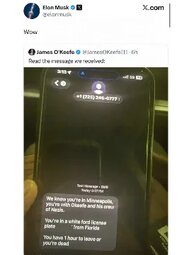 >Threat sent to James Okeefe telling him to leave town within an hour (with his license plate number).