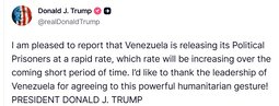 >>24177741 @realDonaldTrump I am pleased to report that Venezuela is releasing its Political Prisoners at a rapid rate, which rate will be increasing over the coming short period of time.