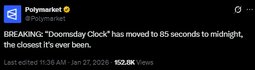 >>24182188, >>24182644 BREAKING: “Doomsday Clock" has moved to 85 seconds to midnight, the closest it's ever been.