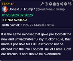 >>24185262 @realDonaldTrump It is the same mindset that gave pro football the new and unwatchable “Sissy” Kickoff Rule, that made it possible for Bill Belichick to not be elected into the Pro Football Hall of Fame. Both are ridiculous and should be overturned!