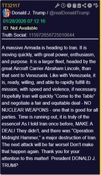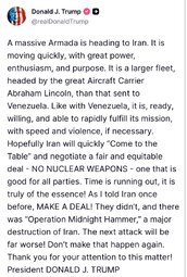 >>24185234 @realDonaldTrump A massive Armada is heading to Iran. It is moving quickly, with great power, enthusiasm, and purpose. It is a larger fleet, headed by the great Aircraft Carrier Abraham Lincoln, than that sent to Venezuela.
