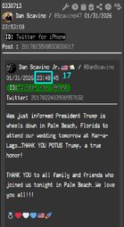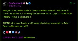 >>24201737 @DanScavino Was just informed President Trump is wheels down in Palm Beach, Florida to attend our wedding tomorrow at Mar-a-Lago—THANK YOU POTUS Trump, a true honor!