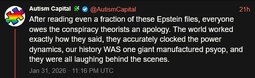 >>24203337, >>24203340, >>24203343, >>24203348, >>24203360, >>24203371, >>24203381, >>24203387, >>24203405, >>24203422, >>24203610, >>24203712, >>24203732, >>24203763, >>24203813, >>24203891, >>24203912, >>24204079, >>24204117, >>24204123, >>24204162, >>24204202 Jeffrey Epstein Related Notables