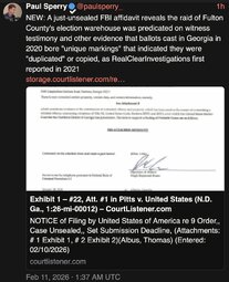 >>24243259, >>24243322 @paulsperry_: NEW: A just-unsealed FBI affidavit reveals the raid of Fulton County's election warehouse was predicated on witness testimony and other evidence that ballots cast in Georgia in 2020 bore "unique markings" that indicated they were "duplicated" or copied, as RealClearInvestigations first reported in 2021