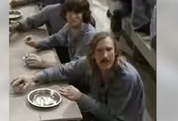 end scene, when the band is in prison when the crowd of convicts starts to dance it is Joe Walsh who jumps up on the table first and starts dancing