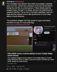 >>24244576, >>24244689, >>24244704, >>24244760 School Shooting in Tumbler Ridge, British Columbia Leaves 10 Killed, Including Shooter – The “Gender” of Shooter Creating Angst