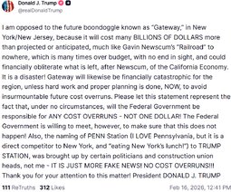 >>24266182 @realDonaldTrump I am opposed to the future boondoggle known as “Gateway,” in New York/New Jersey, because it will cost many BILLIONS OF DOLLARS more than projected