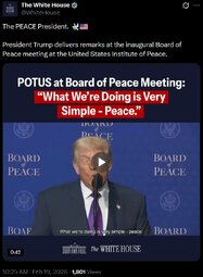 >>24278115 The PEACE President. 🕊️🇺🇸 President Trump delivers remarks at the inaugural Board of Peace meeting at the United States Institute of Peace.