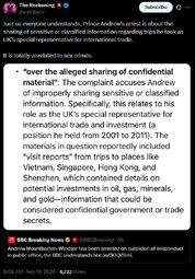 Just so everyone understands, Prince Andrew’s arrest is about the sharing of sensitive or classified information regarding trips he took as UK’s special representative for international trade.