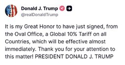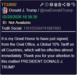 >>24284284, >>24284436 SCOTUS’s ruling basically said Trump was using the wrong law for his tariffs, so Trump just issued the same tariffs under different laws and increased them by 10%.