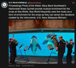 >>24288523 @NavalInstitute - Navy Band Southwest’s Harborside Brass Quintet provide musical enrichment for the orcas at Sea World.