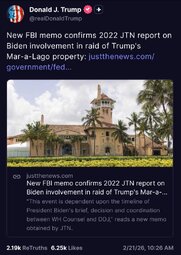 >>24287360, >>24287370 @realDonaldTrump New FBI memo confirms 2022 JTN report on Biden involvement in raid of Trump's Mar-a-Lago property