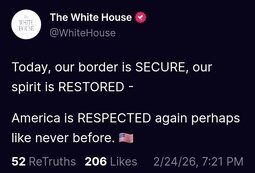 >>24304248 @WH Today, our border is SECURE, our spirit is RESTORED - America is RESPECTED again perhaps like never before