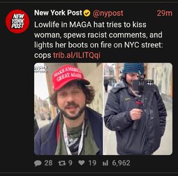 >>24309386 Lowlife in MAGA hat tries to kiss woman, spews racist comments, and lights her boots on fire on NYC street: cops