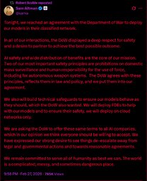 >>24316775 @SecWar - Anthropic delivered a master class in arrogance and betrayal as well as a textbook case of how not to do business with the United States Government or the Pentagon.