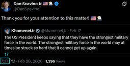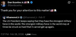 >>24321290, >>24321359 @realDonaldTrump Khamenei, one of the most evil people in History, is dead. This is the single greatest chance for the Iranian people to take back their Country.