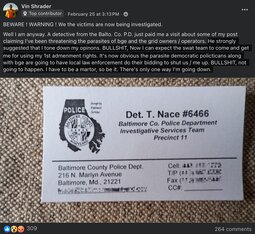 Shrader continued, "BULLSHIT, Now I can expect the swat team to come and get me for using my 1st admenment rights. It's now obvious the parasite democratic policticans along with bge are going to have local law enforcement do their bidding to shut us / me up. BULLSHIT, not going to happen. I have to be a martor, so be it. There's only one way I'm going down."