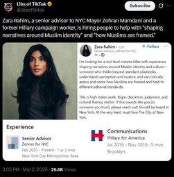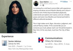 Zara Rahim, a senior advisor to NYC Mayor Zohran Mamdani and a former Hillary campaign worker, is hiring people to help with "shaping narratives around Muslim identity" and "how Muslims are framed."