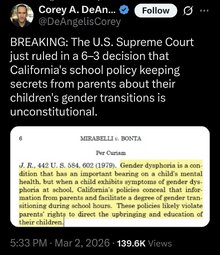 >>24332505 The Supreme Court cleared the way Monday for California schools, order blocks for now a state law that bans automatic parental notification requirements if students change their pronouns or gender expression at school.