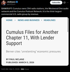 BANKRUPT: Cumulus owns 394 radio stations, the Westwood One audio network and the Cumulus Podcast Network. It is the third-largest commercial U.S. radio group by revenue.