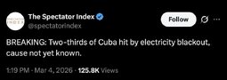 Two-thirds of Cuba hit by electricity blackout, cause not yet known.